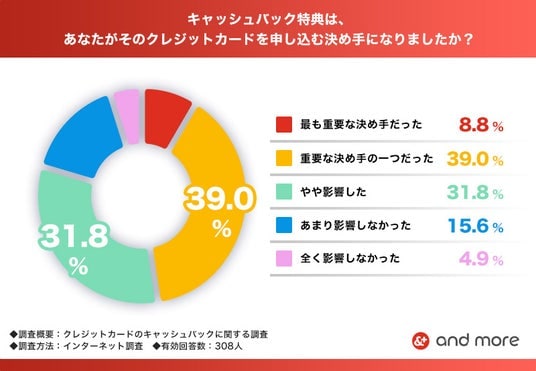 少し角度を変え、申し込み時のキャッシュバック特典についても注目してみましょう。「キャッシュバック特典は、あなたがそのクレジットカードを申し込む決め手になりましたか?」と質問したところ『重要な決め手の一つだった』と回答した方が39.0%で、最多回答となりました。
