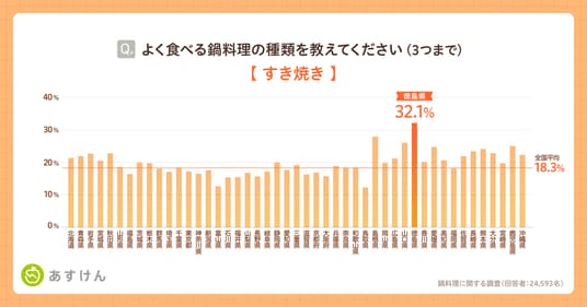 「すき焼き」をよく食べると回答した割合が最も多かった都道府県は「徳島県(32.1%)」でした。徳島県のご当地ラーメンである「徳島ラーメン」には、甘辛いスープに生卵をトッピングする、すき焼きのような味わいのものがあります。ご当地ならではの味わいが、すき焼きへの嗜好の背景にあると考えられます。