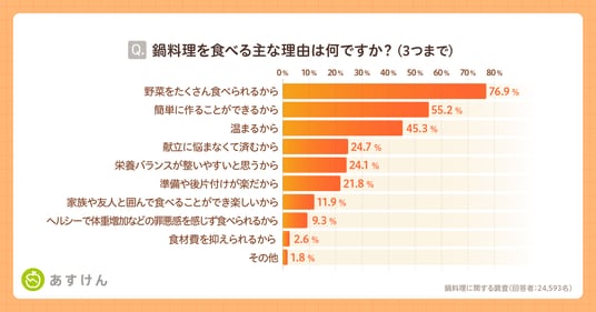 鍋料理を食べる理由として「野菜をたくさん食べられるから(76.9%)」や「栄養バランスが整いやすいと思うから(24.1%)」など、健康・栄養面の理由が上位にあげられました。また、「簡単に作ることができるから(55.2%)」や「献立に悩まなくて済むから(24.7%)」といった、日々の料理の負担軽減面での理由も多数見られました。