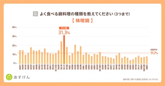 いくつかの鍋の種類ごとに、都道府県別で回答割合を見てみると、「味噌鍋」をよく食べると回答した割合が最も多かった都道府県は「石川県(31.3%)」でした。石川県は歴史的に味噌の製造が盛んで、発酵食文化が深く根付いています。そのため、鍋にも「味噌」を用いる機会が多いことがうかがえます。