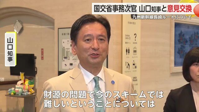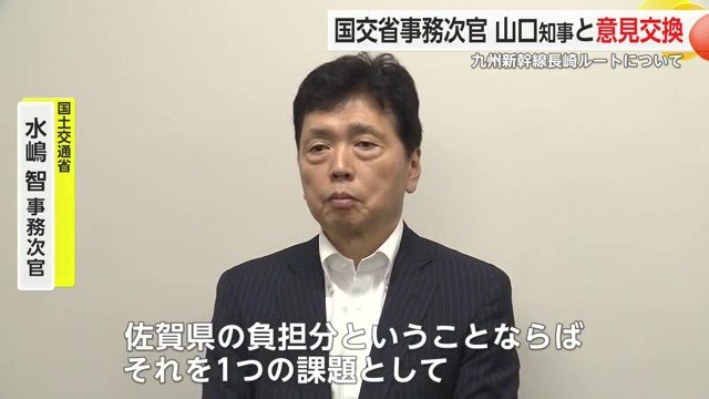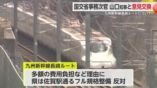 国交省の事務次官が佐賀県の山口知事と面談し、九州新幹線長崎ルートについて意見を交わした。事務次官は「佐賀県の負担分を課題としてテーブルの上に乗せてしっかりと議論していく必要がある」との考えを示した。
