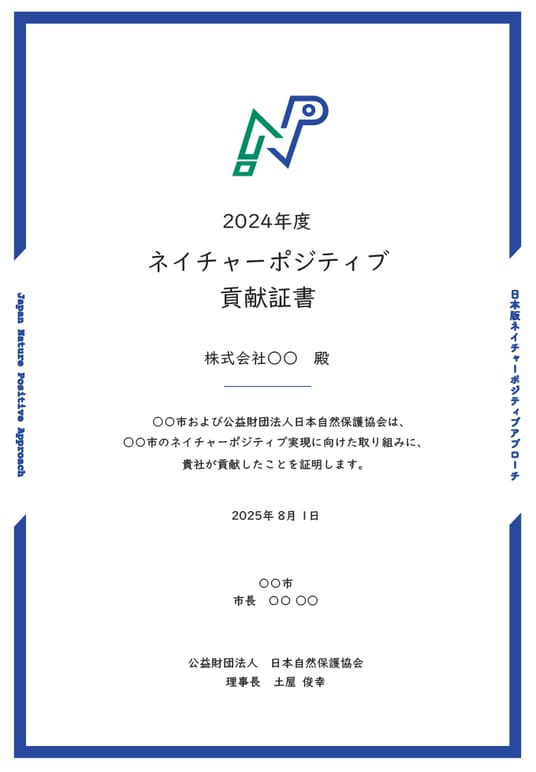 公益財団法人日本自然保護協会(理事長:土屋俊幸、以下NACS-J)は、地域(市町村)全体を見据えたランドスケープアプローチ※1でネイチャーポジティブの実現に取り組んでいる企業の貢献度を評価して「ネイチャーポジティブ貢献証書(以下、貢献証書)」を発行しています。