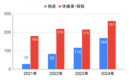東京商工リサーチの調査によると、2024年のネット通販事業者の倒産は261件(前年比21.3%増)に達し、過去最多を記録しました。休廃業・解散も増加しています。特筆すべきは、倒産した企業の多くが負債額5千万円未満・従業員数5人未満の小規模事業者である点です。