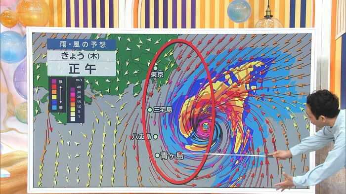 伊豆諸島は平均15~20m/sくらいなので、瞬間的には30~40m/s、立っていられないくらいの風が吹きます。また、東京湾周辺も瞬間的には20m/s近吹きますので外房線や京王線影響が出てくる可能性があります。