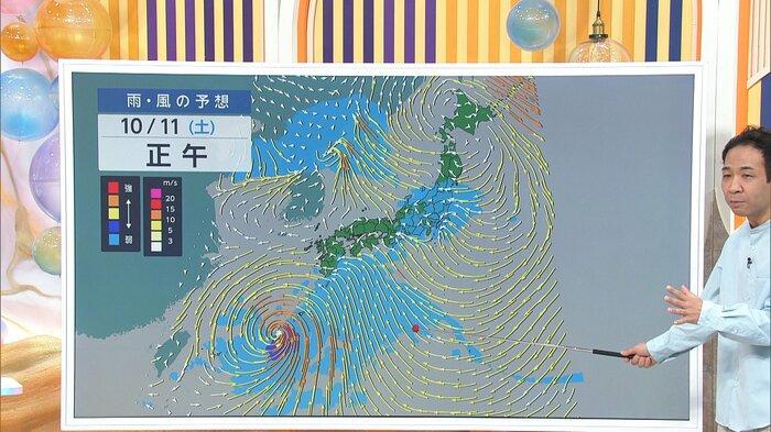 11日(土)のお昼頃、台風23号が沖縄に接近している可能性があります。この雨雲が風に乗って東に移動していく予想になっています。