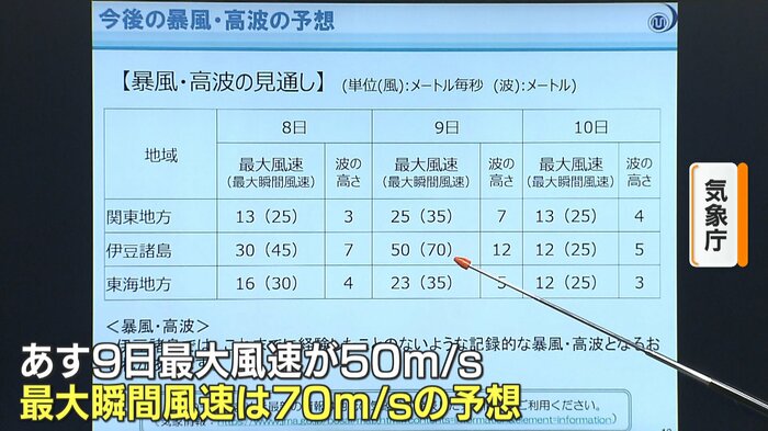 伊豆諸島においてはあす9日最大風速が50m/s、最大瞬間風速70m/sの予想となっています。