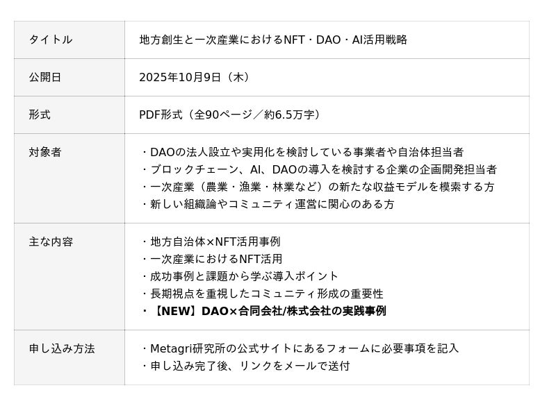 農業web3コミュニティ「Metagri研究所」(運営:株式会社農情人、本社:千葉県船橋市、代表取締役:甲斐雄一郎)は、web3リサーチペーパー『地方創生と一次産業におけるNFT・DAO・AI活用戦略』の改訂版を、2025年10月9日(木)に無料で公開いたします。