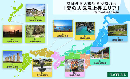 日本政府観光局(JNTO)の発表によると、2025年6月から8月はいずれも訪日外客数が同月過去最高を更新しました(※1)。訪日外国人旅行者が、日本の夏をどのように楽しんでいるのかを明らかにするため、ナビタイムジャパンが提供する訪日外国人観光客向けナビゲーションアプリの利用状況から、夏季に人気が上昇している市区町村を分析いたしました。