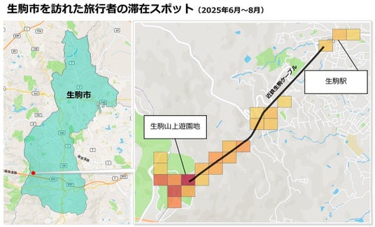 生駒市を訪れた旅行者の滞在スポットを確認すると、生駒駅から近鉄生駒ケーブルを利用して、生駒山上遊園地へ滞在する様子が見られました。