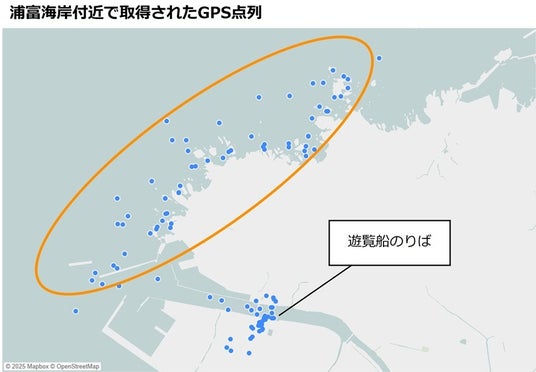 浦富海岸付近で取得されたGPS点列を確認すると遊覧船に乗ってクルージングを楽しんでいる様子が伺えます。
