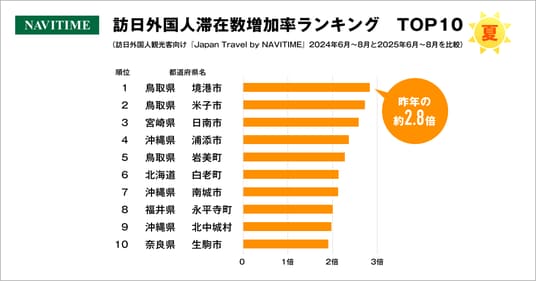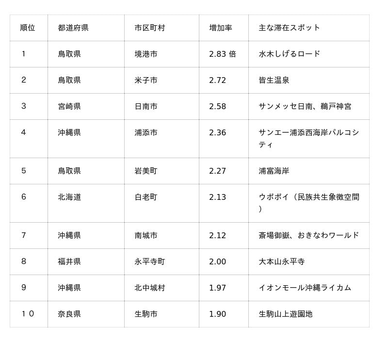 トップの鳥取県境港市は、2024年の滞在数から2.83倍の増加、続く鳥取県米子市は2.72倍の増加となりました。鳥取県から3市町がランクインしているほか、昨年に引き続き沖縄県から3市村がランクインしています。山陰、南九州、沖縄といった海に面したエリアが目立ちました。