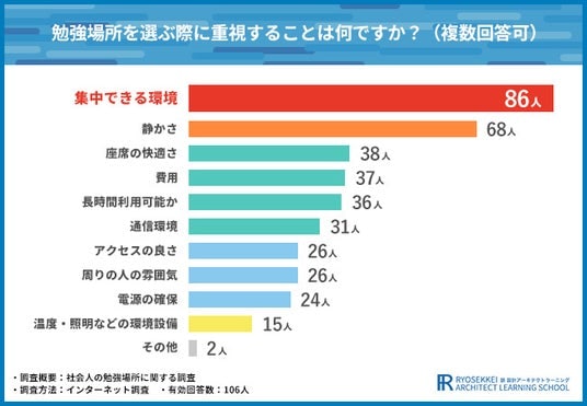 さらに『費用』(37人)や『長時間利用可能か』(36人)といった実用的な面も重視されており、社会人は低コストかつ長時間勉強できる場所を求めていることがわかります。