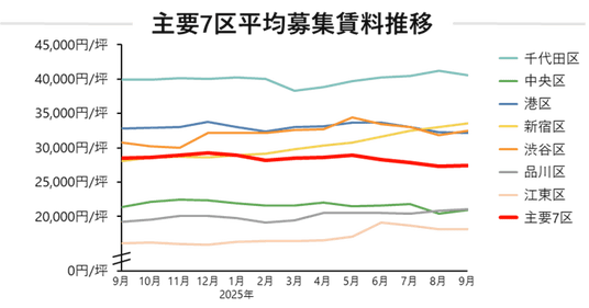 主要7区の平均募集賃料は27,393円/坪で前月比+ 45円/坪。