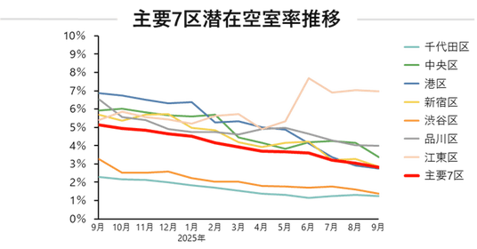 六本木・赤坂エリアの潜在空室率は2024年度に複数の大型物件が竣工した影響により、一時10.67%まで上昇したが、その後順調に回復し、今月は2.96%と2020年3月ぶりに3%を切った。