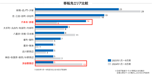 都心7区のオフィス移転先を前年同時期と比較すると「六本木・赤坂エリア」への移転件数が増加する一方で「渋谷駅周辺エリア」への移転件数が減少した。渋谷駅周辺エリアでは2024年5月に渋谷アクシュが竣工して以降大型物件の新規供給がなく需給が逼迫しており、希望条件に合う物件を求めて物件の選択肢が多いエリアへニーズが流出する傾向が強まっている。