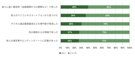 - 故人からの情報がない場合、郵便物やパソコンの履歴から存在を知るケースが最多(40%)