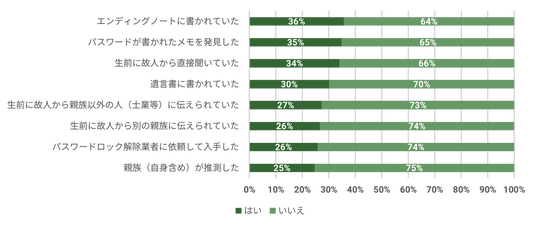 デジタル金融資産の相続において不可欠なID・パスワードの入手方法については、「エンディングノートに書かれていた」が最も多い回答でした。これは、エンディングノートを活用する層においては、デジタル資産の重要性が認識され、ID・パスワードの記載に至っていることを示唆しています。一方で、「親族(自身含め)が推測した」という回答は最も少なく、情報がない中でのアクセスは極めて困難であることが裏付けられました。