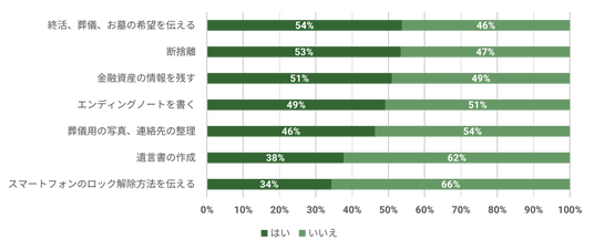相続経験を踏まえ、故人に亡くなる前にしておいてほしかったこととしては、「終活、葬儀、お墓の希望を伝えておいてほしかった」が最多でした。これに続き、「断捨離(物理的にもデジタル面でも持ち物を整理しておいてほしかった)」がほぼ同率で上位に。遺族が故人の意向を尊重したいという想いと同時に、物理的・デジタル的な整理への強い要望が見て取れます。