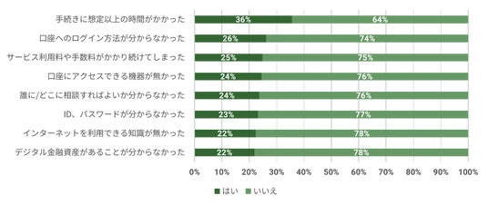 デジタル金融資産の相続で最も困ったこととして、「手続きに想定以上の時間がかかった」が最多でした。資産の存在が不明瞭であることや、ID・パスワードが分からないといったデジタル資産特有の問題が、相続手続きを長期化させ、遺族の精神的・時間的負担を増大させている実態が明らかになりました。