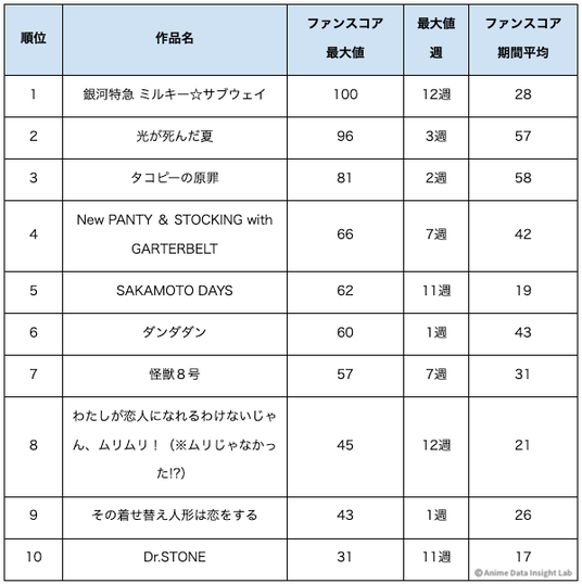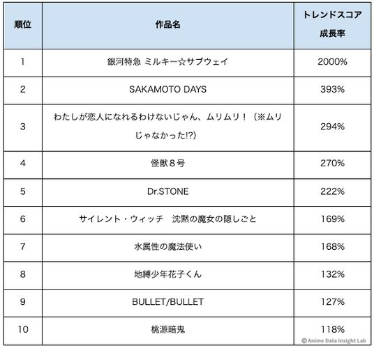 トレンドスコア成長率TOP10とファンスコア成長率TOP10を比較すると、両方で200%以上を記録した作品は『銀河特急 ミルキー☆サブウェイ』『わたしが恋人になれるわけないじゃん』『SAKAMOTO DAYS』『Dr.STONE』の4作品となった。