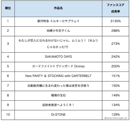 トレンドスコア成長率TOP10とファンスコア成長率TOP10を比較すると、両方にランクインしている作品は『銀河特急 ミルキー☆サブウェイ』『わたしが恋人になれるわけないじゃん』『Dr.STONE』『地縛少年花子くん』の4作品となった。これらは認知度とファン活動の両面で成長した作品だ。