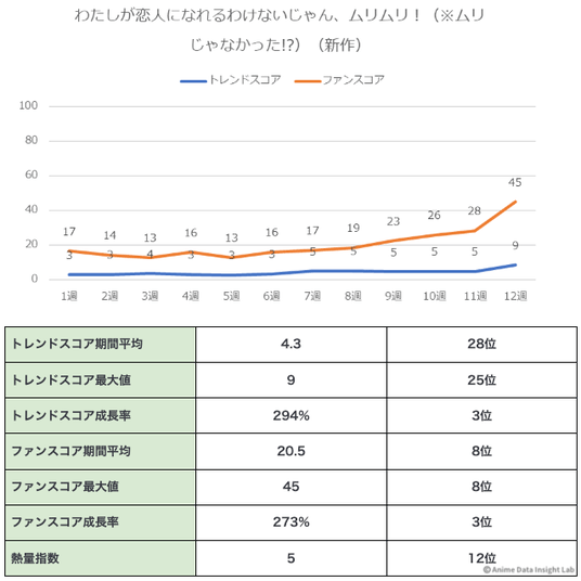 本作品の推移は特徴的だ。第1-7週まではトレンドスコア2-7、ファンスコア3-10と低水準で推移していたが、第8週から状況が一変した。トレンドスコア23、ファンスコア47と大きく跳ね上がり、そこから加速が続いた。第12週(最終週)には、トレンドスコア39、ファンスコア100でピークを記録している。