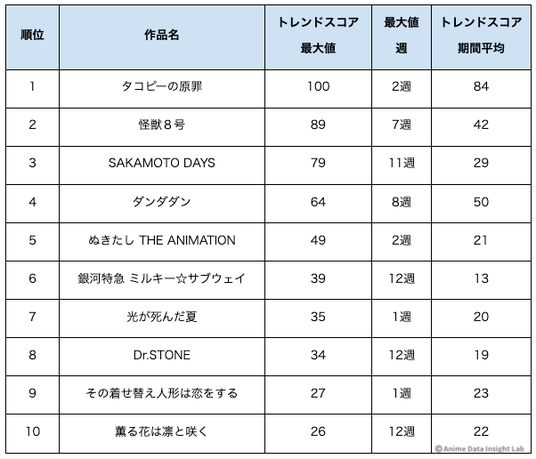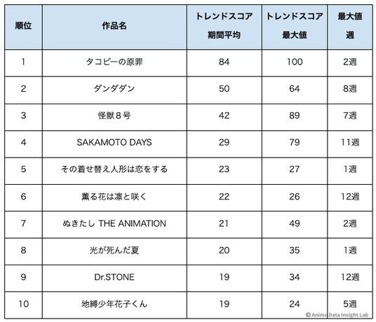 トレンドスコア最大値TOP10を見ると、第1週・第2週に最大値を記録した作品が5作品ある一方、第7週以降に最大値を記録した作品も4作品ある。初速型と後半伸び型が混在している。