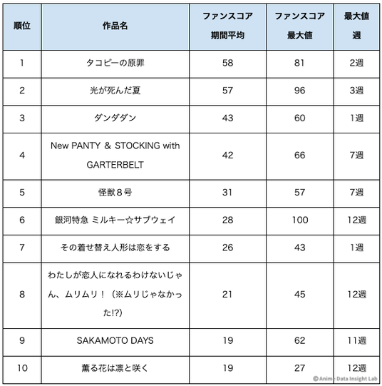 『タコピーの原罪』『光が死んだ夏』『ダンダダン』の3作品は、期間平均・最大値ともにTOP10に入っており、ファン活動が継続的に活発だったことがわかる。
