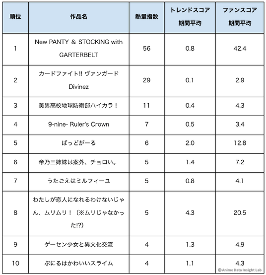 熱量指数TOP10を見ると、トレンドスコア期間平均が低い作品が多数ランクインしている。『New PANTY & STOCKING』は熱量指数56で1位だが、トレンドスコア期間平均は0.8と低い。一方でファンスコア期間平均は42.4と高く、認知度は低いがファン活動が活発な作品だ。
