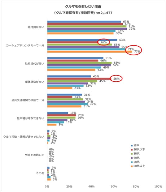 クルマを保有していない人に保有しない理由を聞くと、「維持費が高い」67%、「カーシェアやレンタカーで十分」63%が上位に並びました。