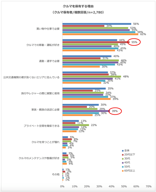 年代別で見ると、年代が上がるほど買い物や仕事のためにクルマを保有する比率が高くなりました。一方、20代以下は「クルマでの移動・運転が好き」が55%と最多になり、他の年代と比較して比率が10ポイント以上高い結果となりました。また、40代は「家族・親族の送迎」が39%となり、他の年代よりも約10ポイント高くなるなど、世代によってクルマを保有する理由に違いが見られました。