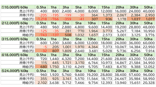 図2 コメ価格(概算金ベース)別の農家規模別の売上・利益・所得など