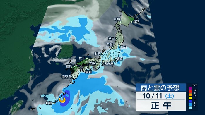 11日(土)正午の予想では、沖縄付近に台風の雲が広がり、その北側の雨雲が九州、四国、近畿などにかかる。