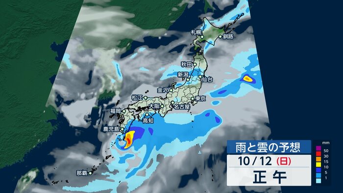12日(日)正午になると、台風23号の雨雲は九州を覆い、雨雲は伊豆諸島まで長く伸びる。秋雨前線は日本海から東北地方に停滞し、北海道や東北、北陸では雨が降る。