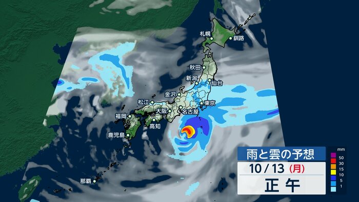 13日(月・祝)正午になると、台風23号の雨雲が本州の南の海上を東に進む予想で、秋雨前線の雨雲は南下して、関東など東日本にかかる予想。晴れるのは北海道の一部と西日本の一部だけで、全国的にすっきりしない。