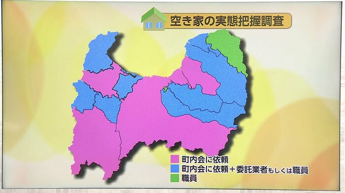 県内15市町村すべてで空き家の実態把握調査が実施されているが、その方法は3つのパターンに分かれる。世帯数が少ない舟橋村と朝日町では役場職員が自前で調査を行い、富山市を含む一部の自治体では空き家の状況を含めた調査を町内会に依頼している。町内会に空き家の場所だけを調べてもらい、詳細な状況確認は職員や委託業者が行う市や町もある。