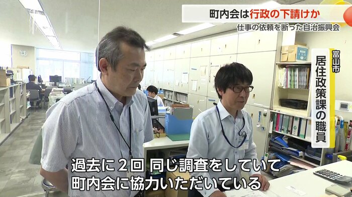 富山市は市議会で、すべての部局からの町内会への依頼事項を見直す方針を示した。市民生活部の鎌田泰史部長は「これまでやってきたから、毎年の定例調査だからという理由で地域に依頼している調査もあると思う。これまでのやり方を検証し、地域の負担が少しでも下がるような方法について検討していきたい」と述べた。