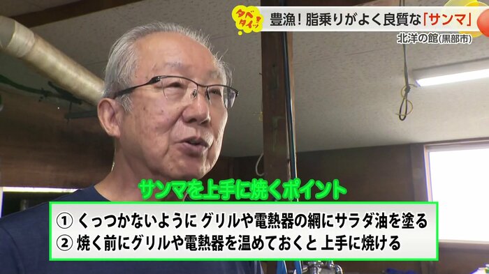「グリルの下(網)にくっつく場合があるのでそういう時はサラダ油をちょっと下に塗ってそれで上に置いて焼く。電熱機をまず余熱をかけて少し温めてからそのところにサンマを入れる。そうすると焼きが良い」と松野社長は語る。