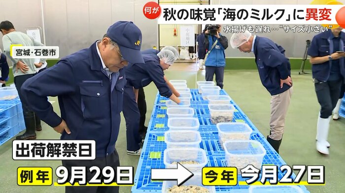 宮城・石巻市で開かれたのは、カキの品質検査だ。県内からむき身のカキが集められ、県の漁協が大きさや色などを確認する。