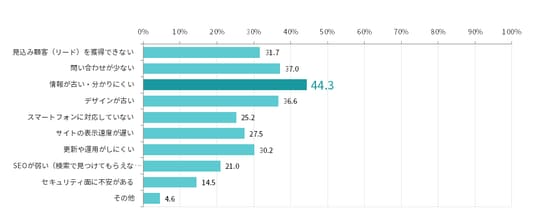 リニューアル前のサイトの課題として最多回答を得たのは、「情報が古い・分かりにくい」で44.3%。Webサイトの基本的な機能を果たせていないことがリニューアルの大きな動機となっています。これに続いたのが「問い合わせが少ない」(37.0%)と「デザインが古い」(36.6%)でした。