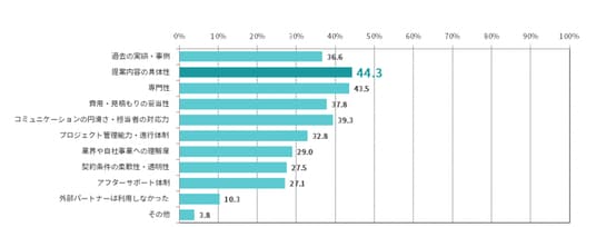 - パートナー選定で重視したポイントは、「提案内容の具体性」が44.3%でトップ。次いで「専門性」が43.5%で2位となった。