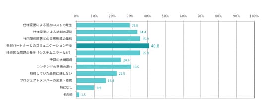 - プロジェクト進行中の課題として最も多く挙げられたのは、「外部パートナーとのコミュニケーション不全」で40.8%。