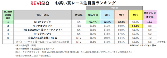 注目度を見ると、個人全体・MF1層・MF2層の3属性において「M-1グランプリ(以下M-1)」が首位を獲得しました。M-1は世帯テレビオン率(いわゆる世帯視聴率と同義)においても他の賞レースを大きく上回り、お笑い賞レースで最も視聴者の関心を集める大会といえそうです。大会は今年で21回目を数え、もはやお笑いファンだけでなく多くの視聴者にとっての「恒例イベント」として存在感を放っています。