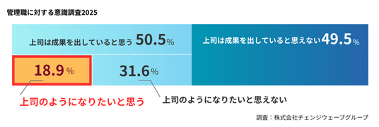 若手社員(25~34歳)を対象にした本調査では、「成果を出しており、”自分も目指したい”と思う上司がいる」と答えたのはわずか18.9%にとどまりました。