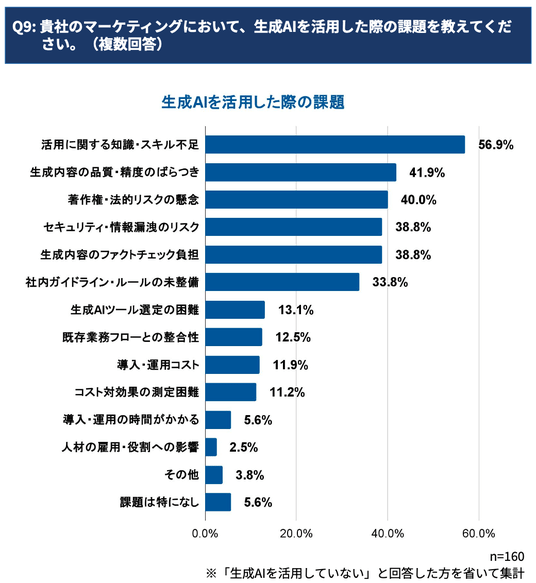 BtoBマーケターの56.9%が「活用に関する知識・スキル不足」を、そして41.9%が「生成内容の品質・精度のばらつき」を課題として挙げていることが判明しました。