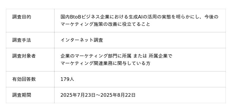 株式会社シーラベルが主体となり、BtoBマーケティング支援企業12社が共同で、国内のBtoBビジネス企業における生成AIの活用実態に関する調査を実施しました 。本調査は、企業のマーケティング部門に所属、または所属企業でマーケティング関連業務に関与している方などを対象に行われ、179件の有効回答数を得ています。