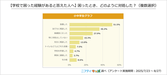 最も多かった回答は「我慢した」で、小中学生の51.5%にのぼりました。困りごとを周囲に伝えず、ひとりで抱え込んでいる人が多いようです。