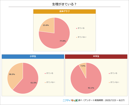 小学生では61.5%、中学生では92.1%の子どもたちが「生理がきている」と回答しました。