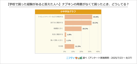「トイレットペーパーなどで対処する」と「友だちに相談する」がそれぞれ約3割で、上位を占めました。