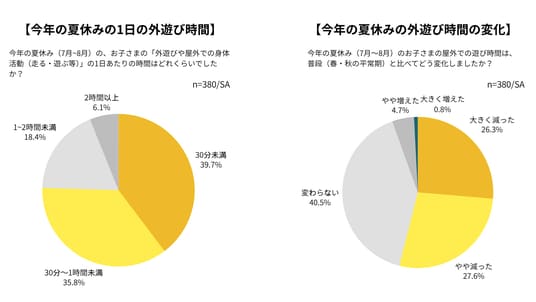 その結果、今年の夏休みの1日あたりの外遊び時間が「30分未満」が約4割、「1時間未満」にとどまる子どもが約7割にのぼりました。